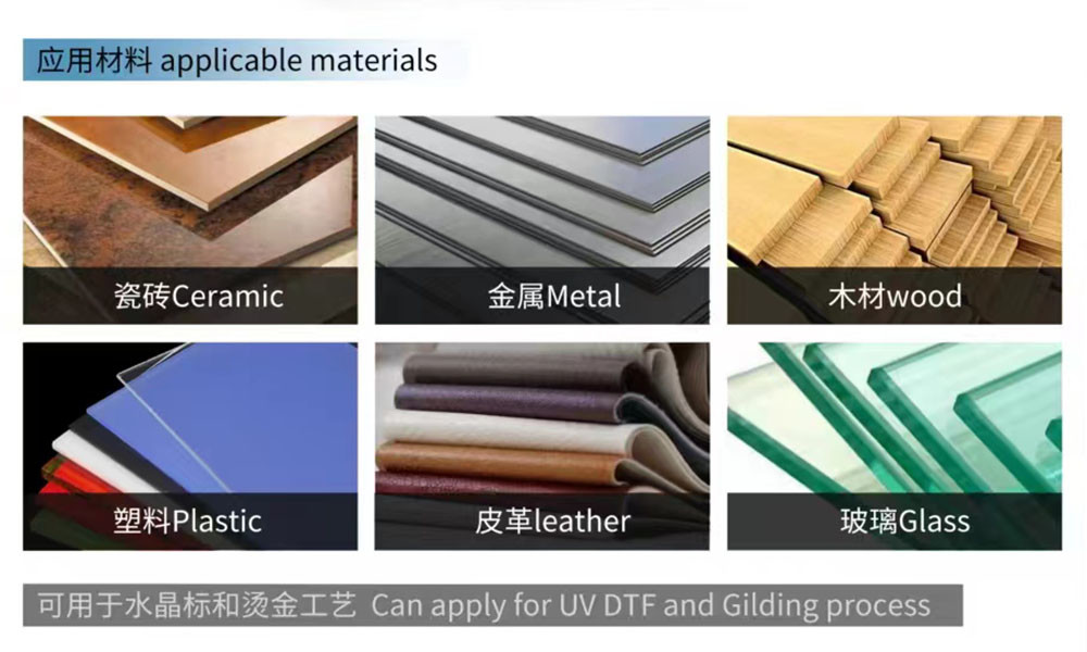 UV-printtoepassingsmaterialen: PVC, reflecterende folie, canvas, tapijt, leer, glas, keramische tegels, metaal, plafond, aluminium, hout, deur, acrylplaat, plexiglasplaat, schuimplaat, golfkarton, etc.